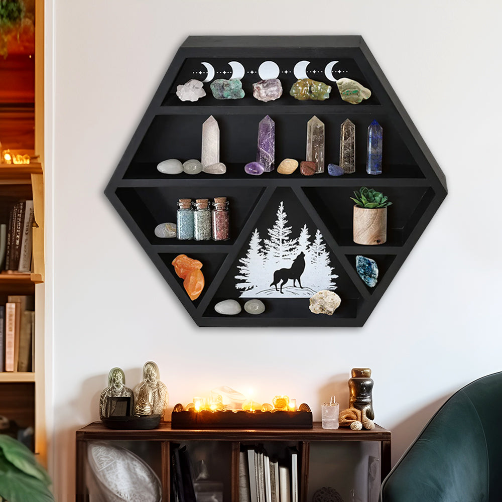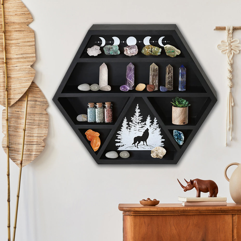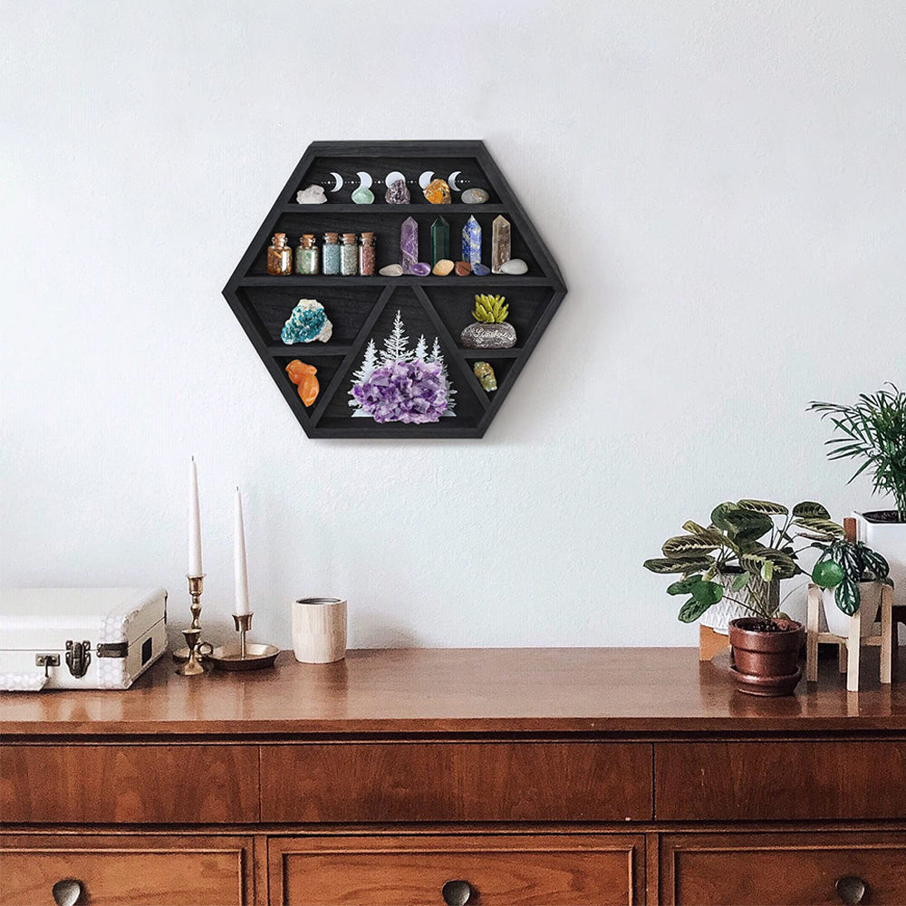 The crystal shelves can display spiritual crystals, essential oils, chakra stones, rocks, succulents, candles, gothic witch hippie spirits, or any other gothic and zen decorations.