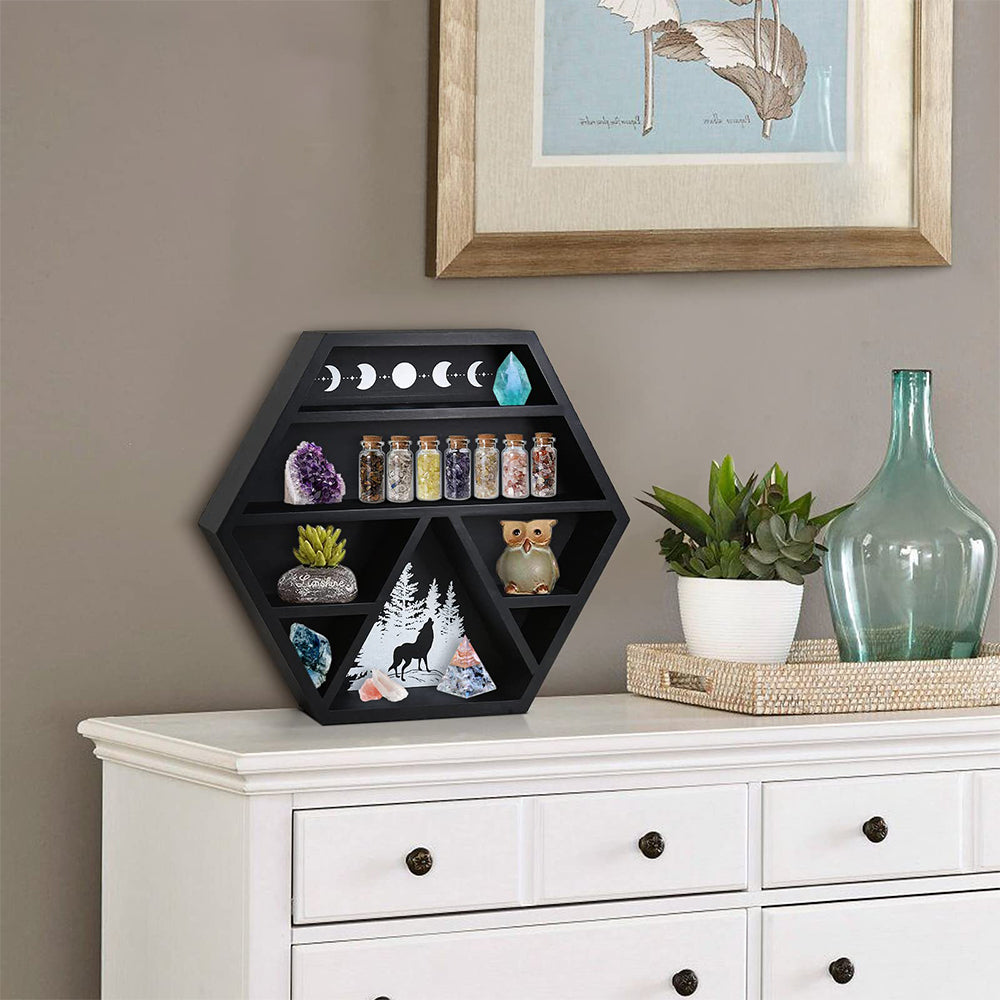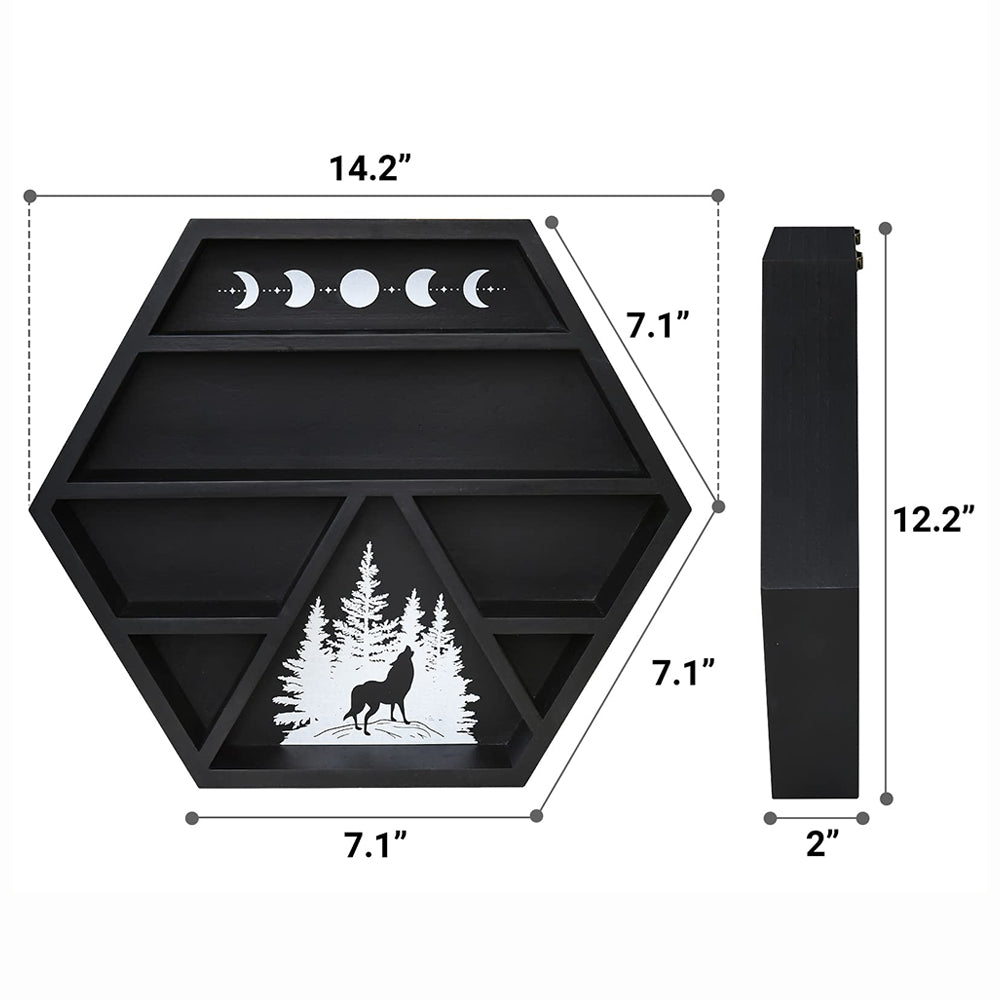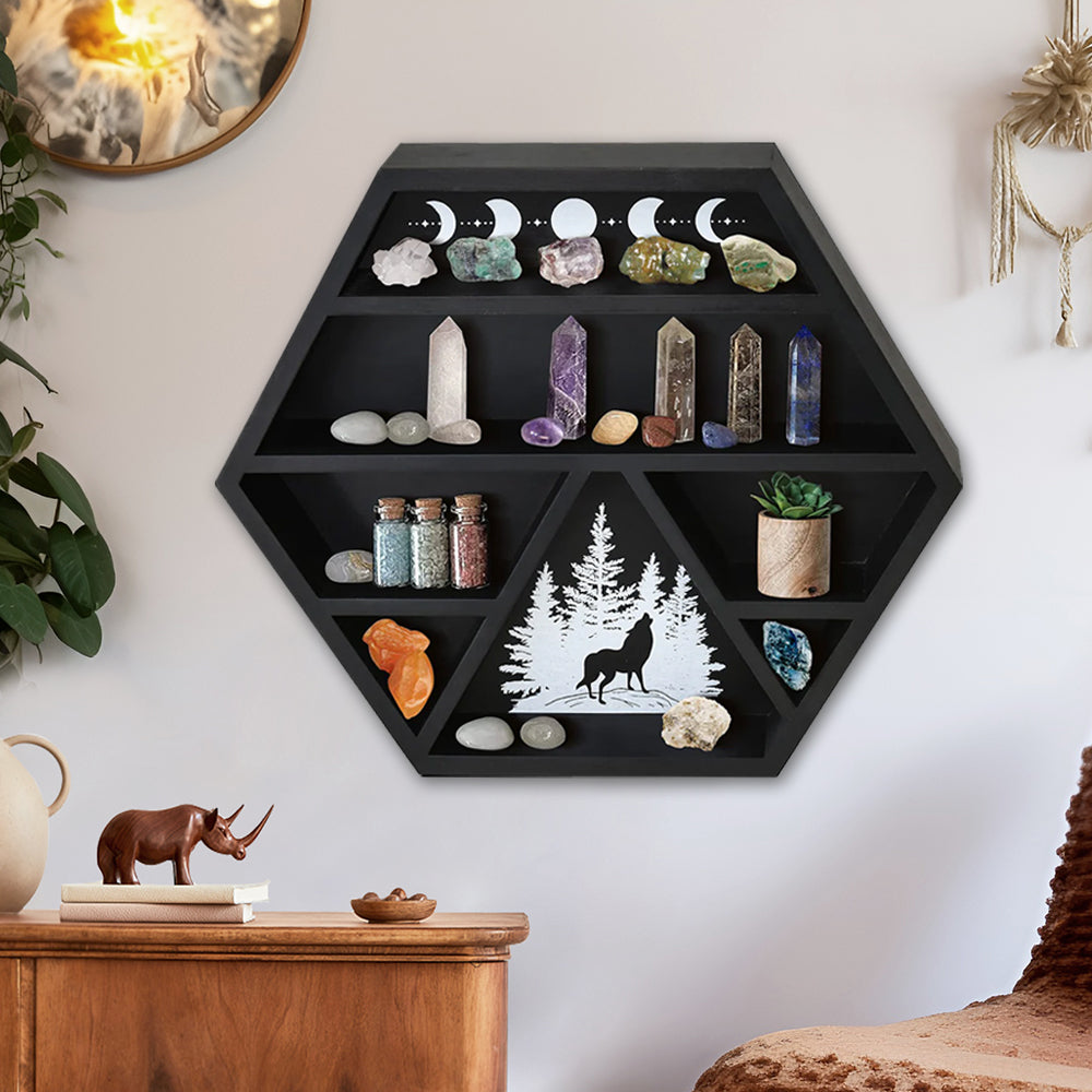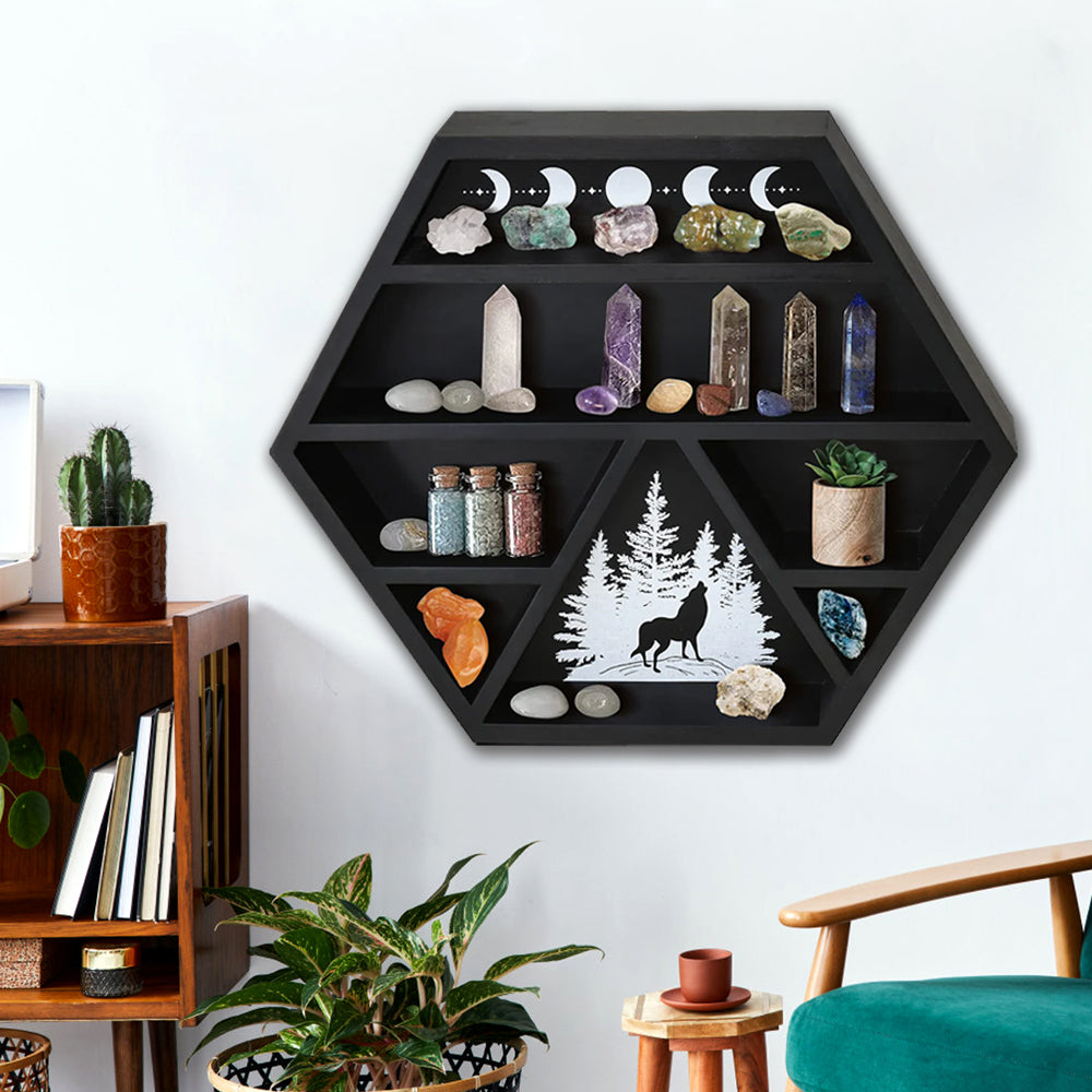 The crystal shelves can display spiritual crystals, essential oils, chakra stones, rocks, succulents, candles, gothic witch hippie spirits, or any other gothic and zen decorations.