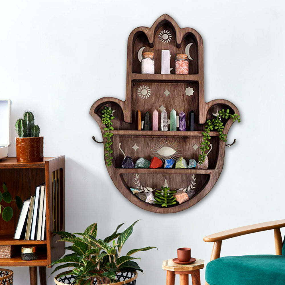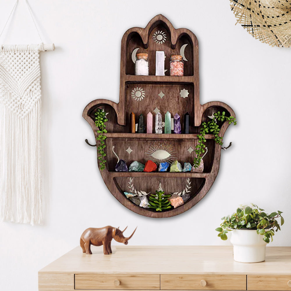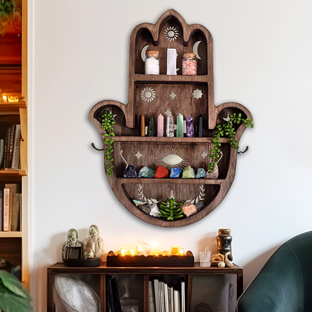 The crystal shelves can display spiritual crystals, essential oils, chakra stones, rocks, succulents, candles, gothic witch hippie spirits, or any other gothic and zen decorations.