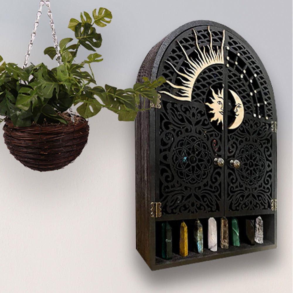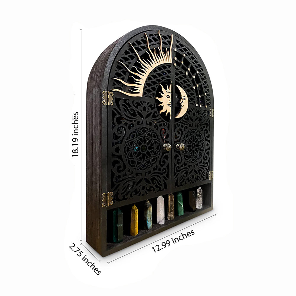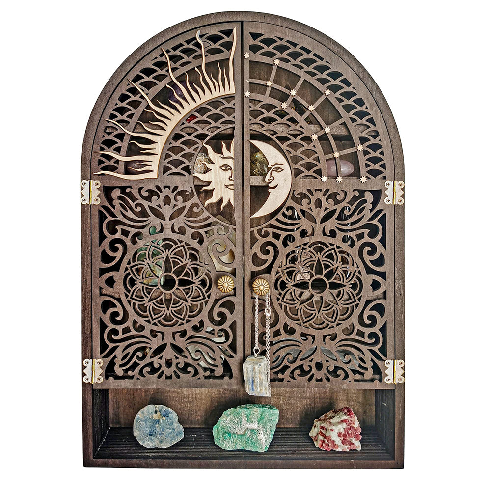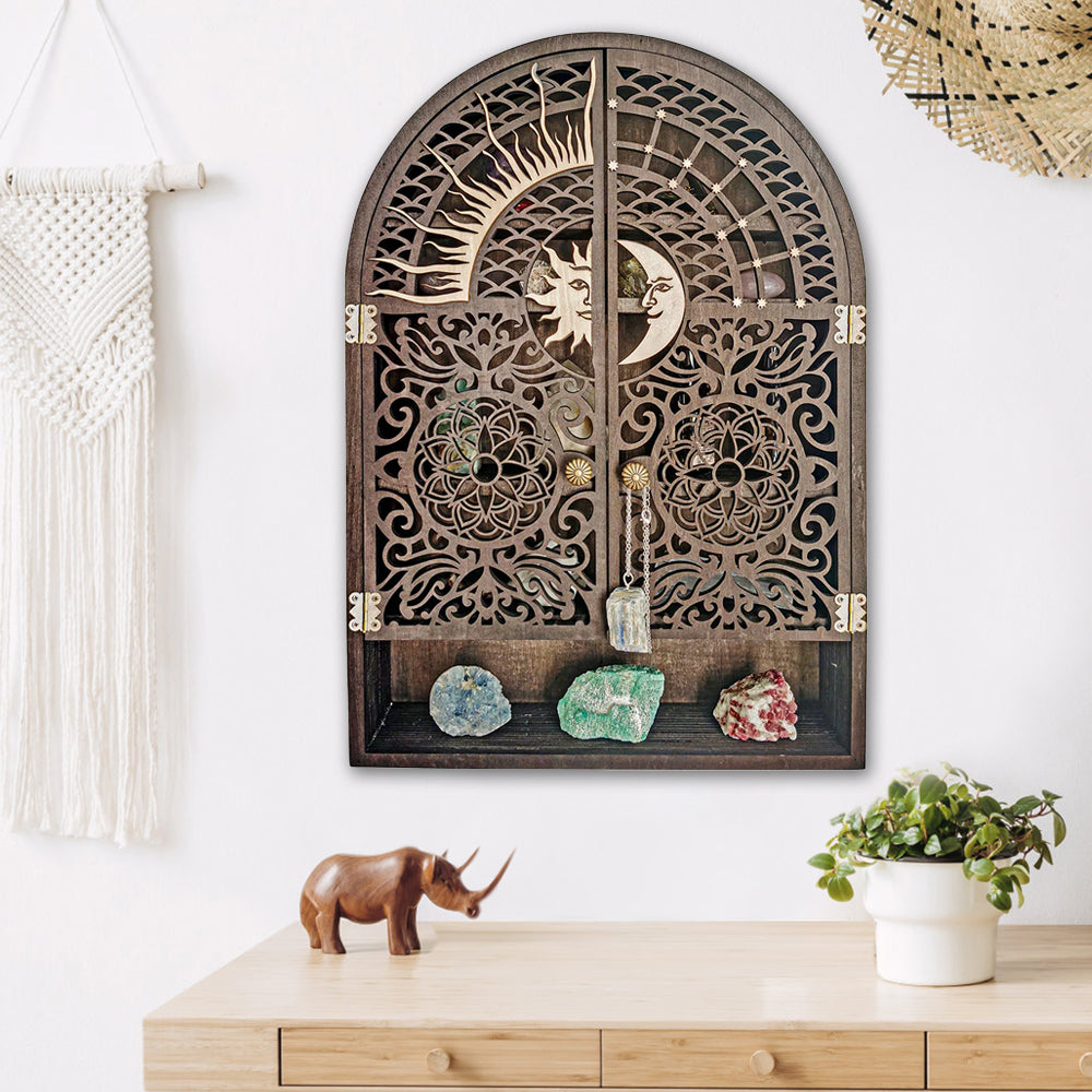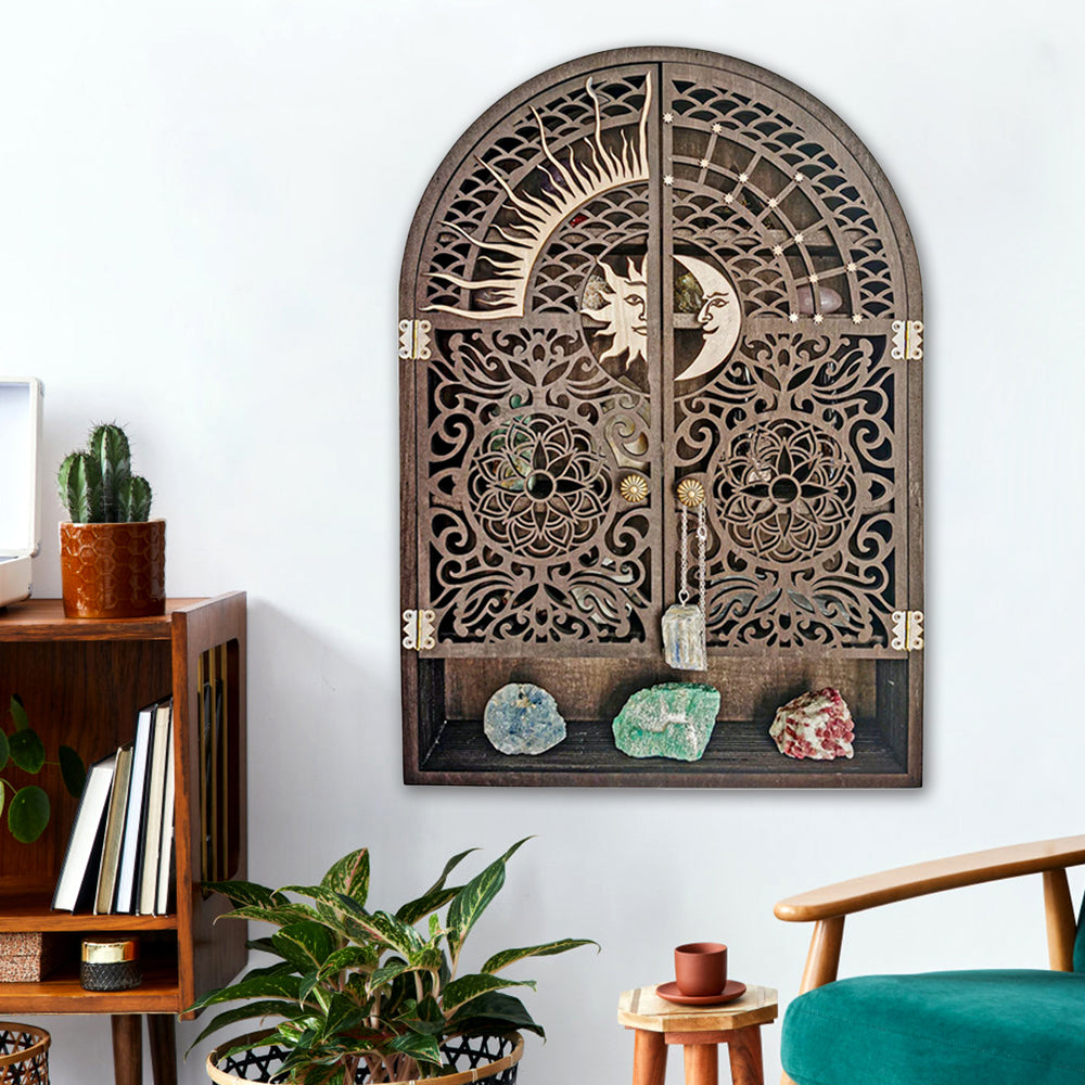 The crystal shelves can display spiritual crystals, essential oils, chakra stones, rocks, succulents, candles, gothic witch hippie spirits, or any other gothic and zen decorations.