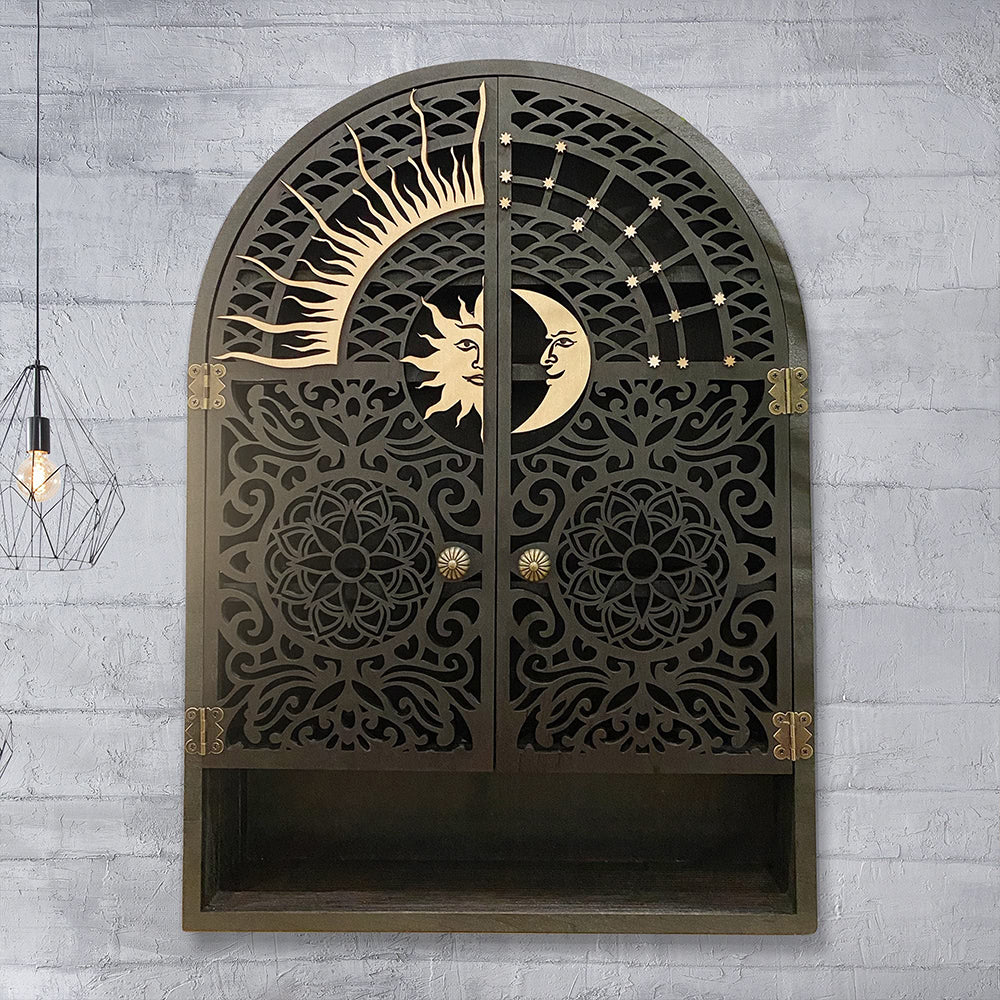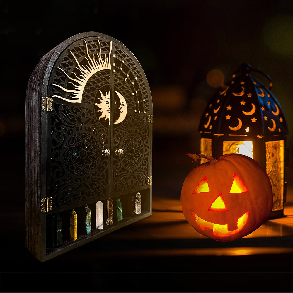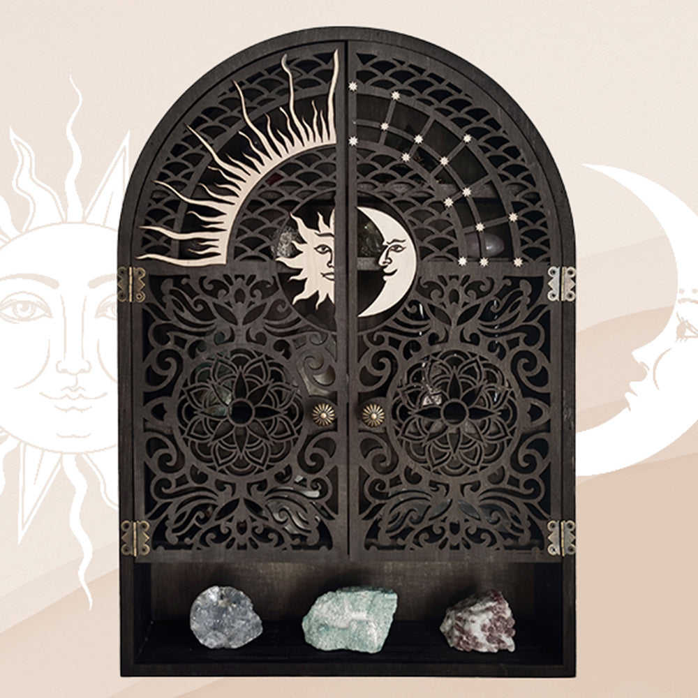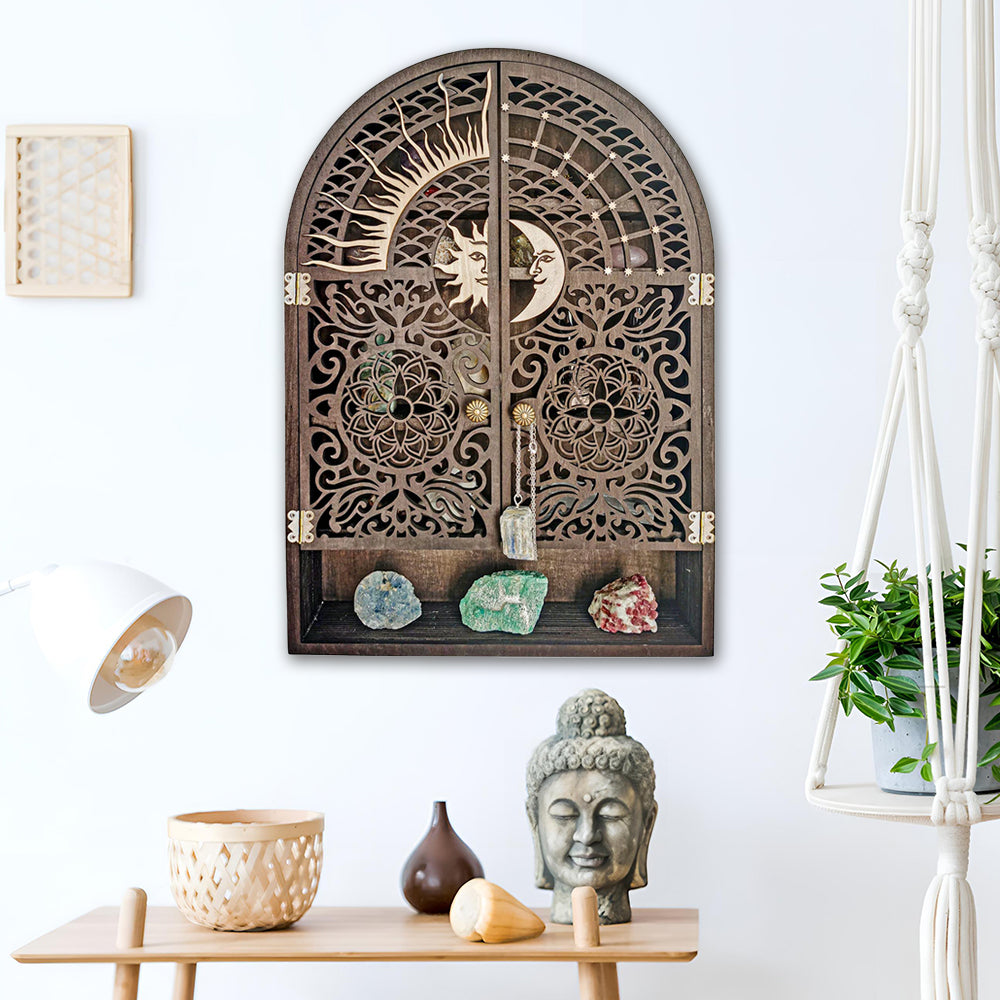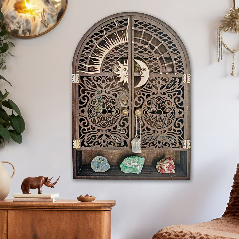 The crystal shelves can display spiritual crystals, essential oils, chakra stones, rocks, succulents, candles, gothic witch hippie spirits, or any other gothic and zen decorations.